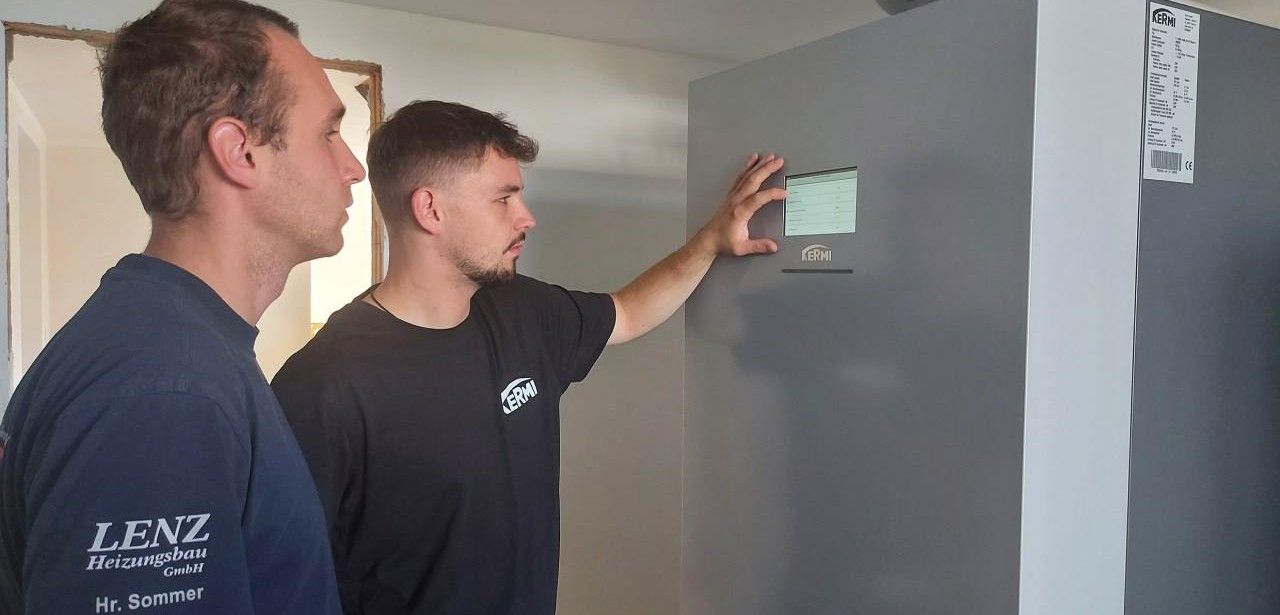 Im Rahmen der gemeinsamen Systemeinrichtung führten Servicetechniker Philipp Blüml von KERMI und Installateur M. Sommer präzise Kalibrierungs- und Einstellungsarbeiten durch. Während der unmittelbaren Vor-Ort-Schulung erhielten die Monteure von Lenz Heizungsbau detaillierte Anleitung zur Konfiguration der Regelungsparameter sowie Hinweise zur Wartung und Störungsbehebung. Die praktische Einweisung ermöglichte eine umfassende Funktionsprüfung und sicherte die korrekte Zusammenarbeit aller Komponenten. Damit profitiert der künftige Betrieb von hohem Praxis-Know-how, konstanter, sicherer, dauerhafter und effizienter Leistung.