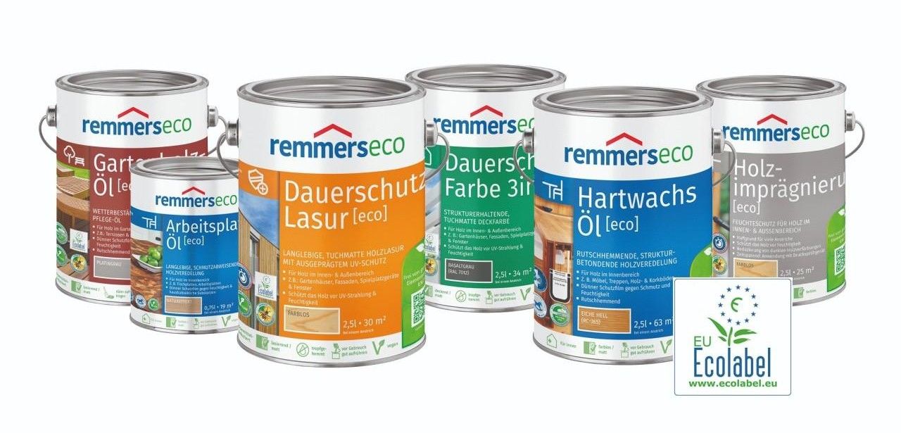 Das EU-Ecolabel-Sortiment von Remmers im Fachhandel umfasst das farblose Arbeitsplatten-Öl [eco], Hartwachs-Öl [eco], die effektive Dauerschutz-Farbe 3in1 [eco], die witterungsbeständige Dauerschutz-Lasur [eco]sowie das schützende Gartenholz-Öl [eco]. Ob Möbelbeschichtungen, stark beanspruchte Innentüren oder Balkon- und Terrassenbeläge: Die Öle und Farben garantieren hohe Wetter- und Abriebresistenz bei gleichzeitig umweltschonender Herstellung und gesundheitlicher Unbedenklichkeit. Ihre einfache Verarbeitung erleichtert Heimwerkern nachhaltiges Arbeiten. Alle Produkte ermöglichen langfristigen Schutz und verleihen Holzoberflächen natürlichen Glanz ohne Kompromiss bei Umweltkriterien.