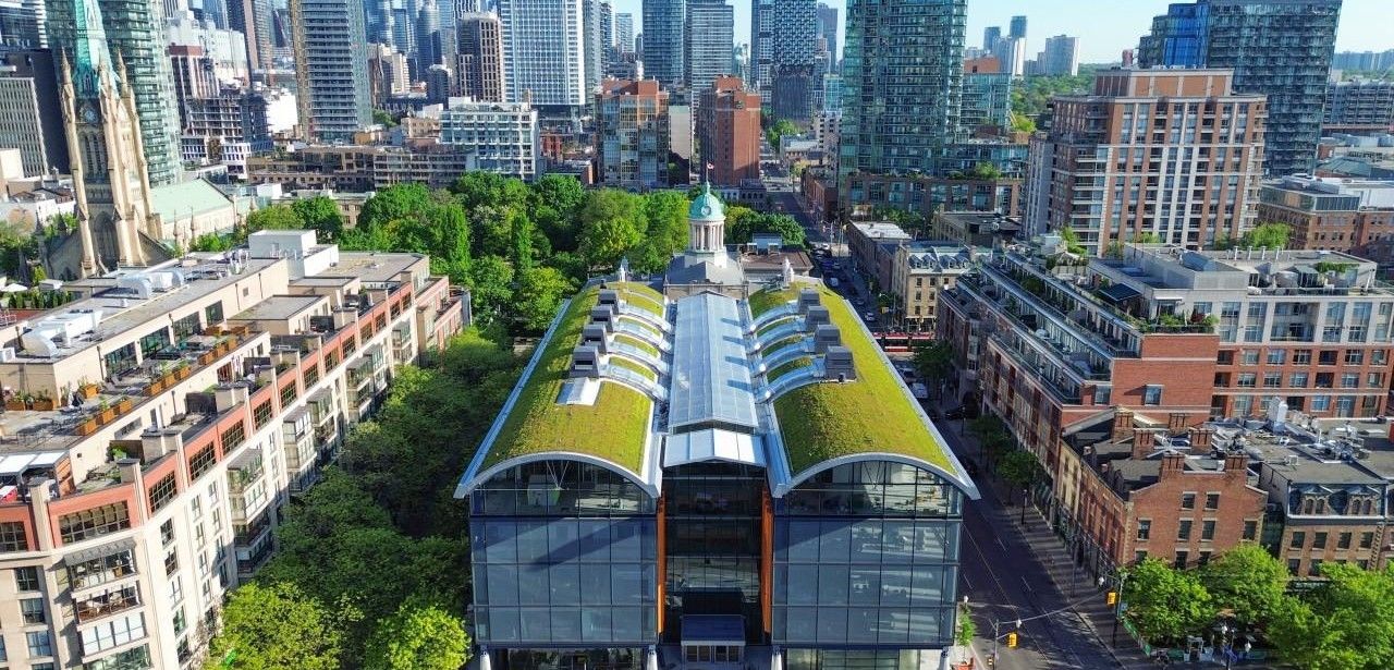 Das historische Areal des St. Lawrence Market dient seit 1803 als Handels- und Versammlungsort in Toronto. Die fünf Etagen des Market North von RSHP und Adamson Associates Architects umfassen Märkte, Büros und Galerien, verbunden durch ein zentrales, verglastes Atrium. Auf 1.500 Quadratmetern Dachfläche sorgen Zinco-Lösungen mit Floraset FS 75 und Georaster für verbesserte Wärmedämmung, Verdunstungskühlung und Regenwasserrückhalt, was Effizienz steigert und urbane Biodiversität fördert und bildet einen stabilen, grünen Lebensraum.
